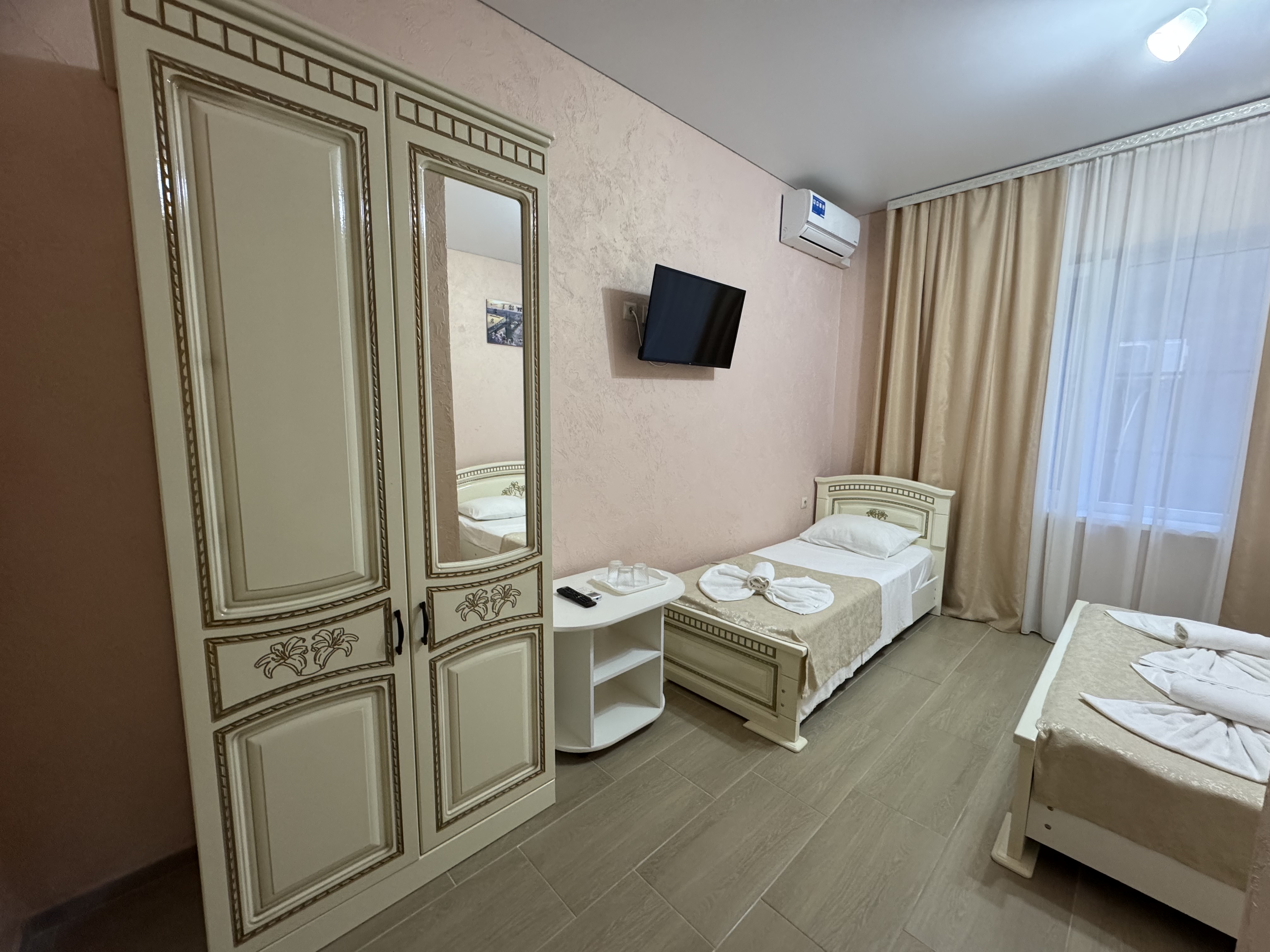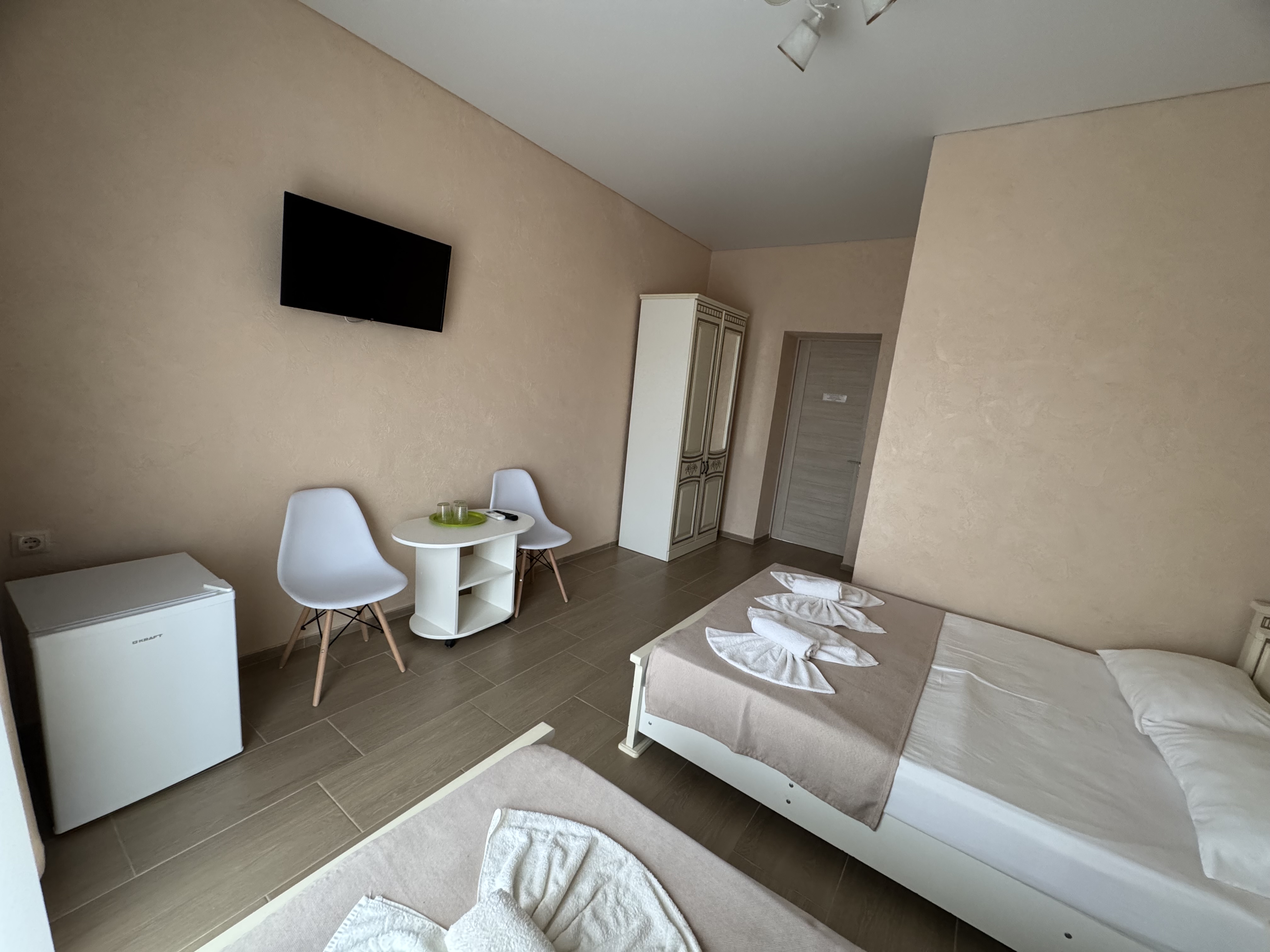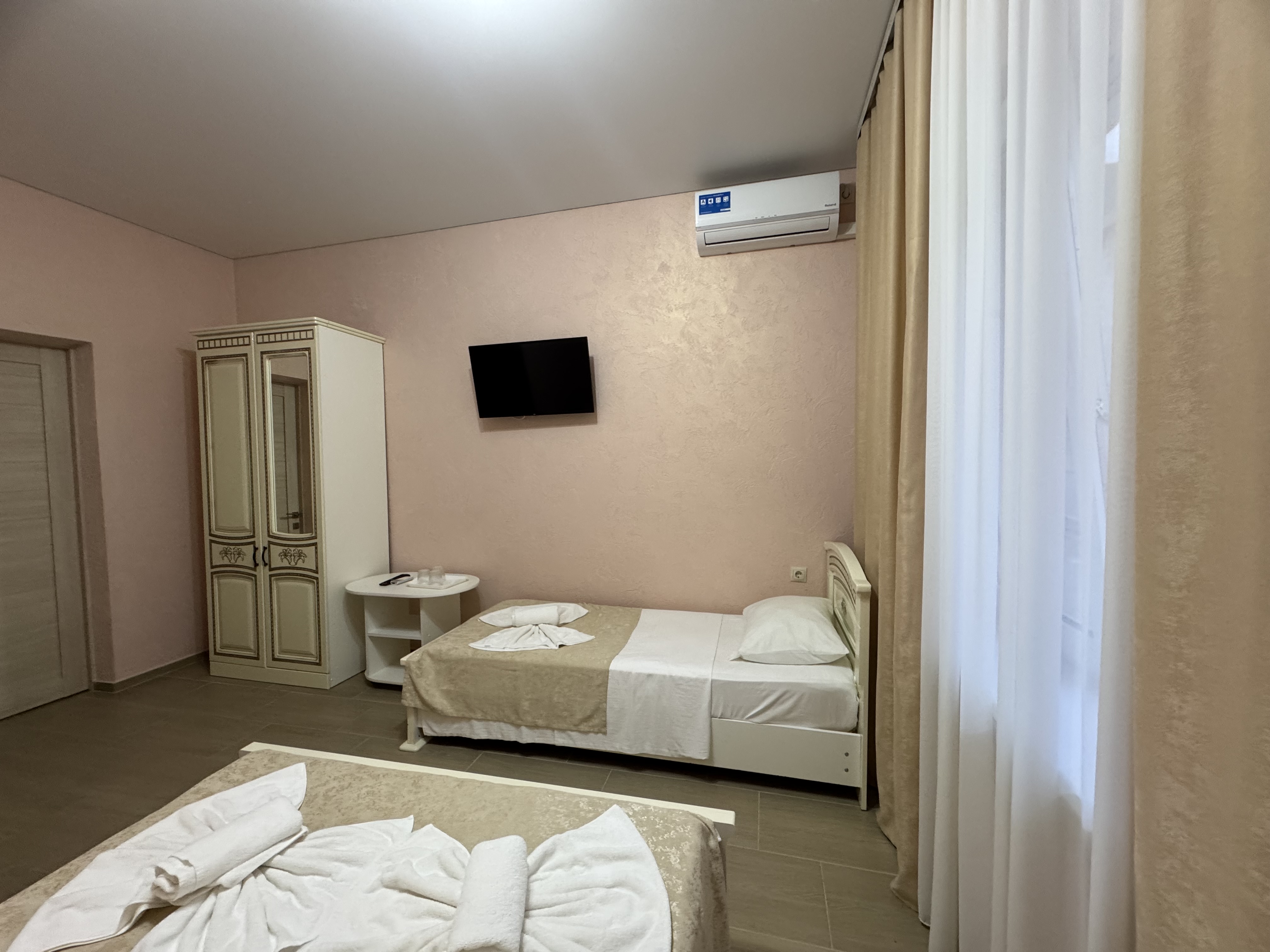 Номер на 2 этаже с балконом 22 кв м. , имеет разную планировку кроватей. Оборудование: телевизор, спутниковое, цифровое тв, холодильник, кондиционер, фен, средства личной гигиены Удобства: туалет и душ в номере, санузел совмещенный Смена полотенец 1 раз в 4 дня( по запросу ), уборка номера со сменой постельного белья и полотенец 1 раз в 8 дней