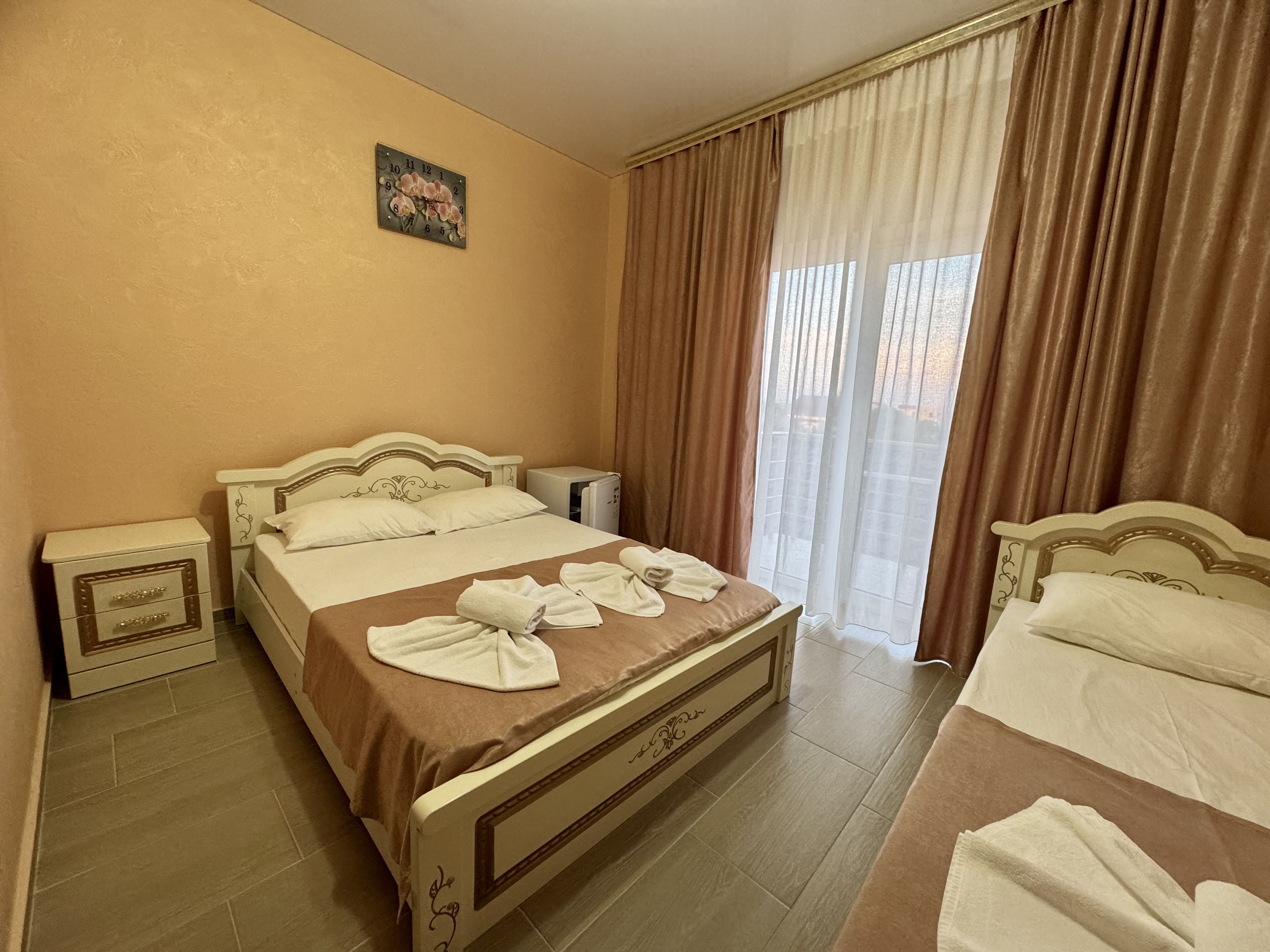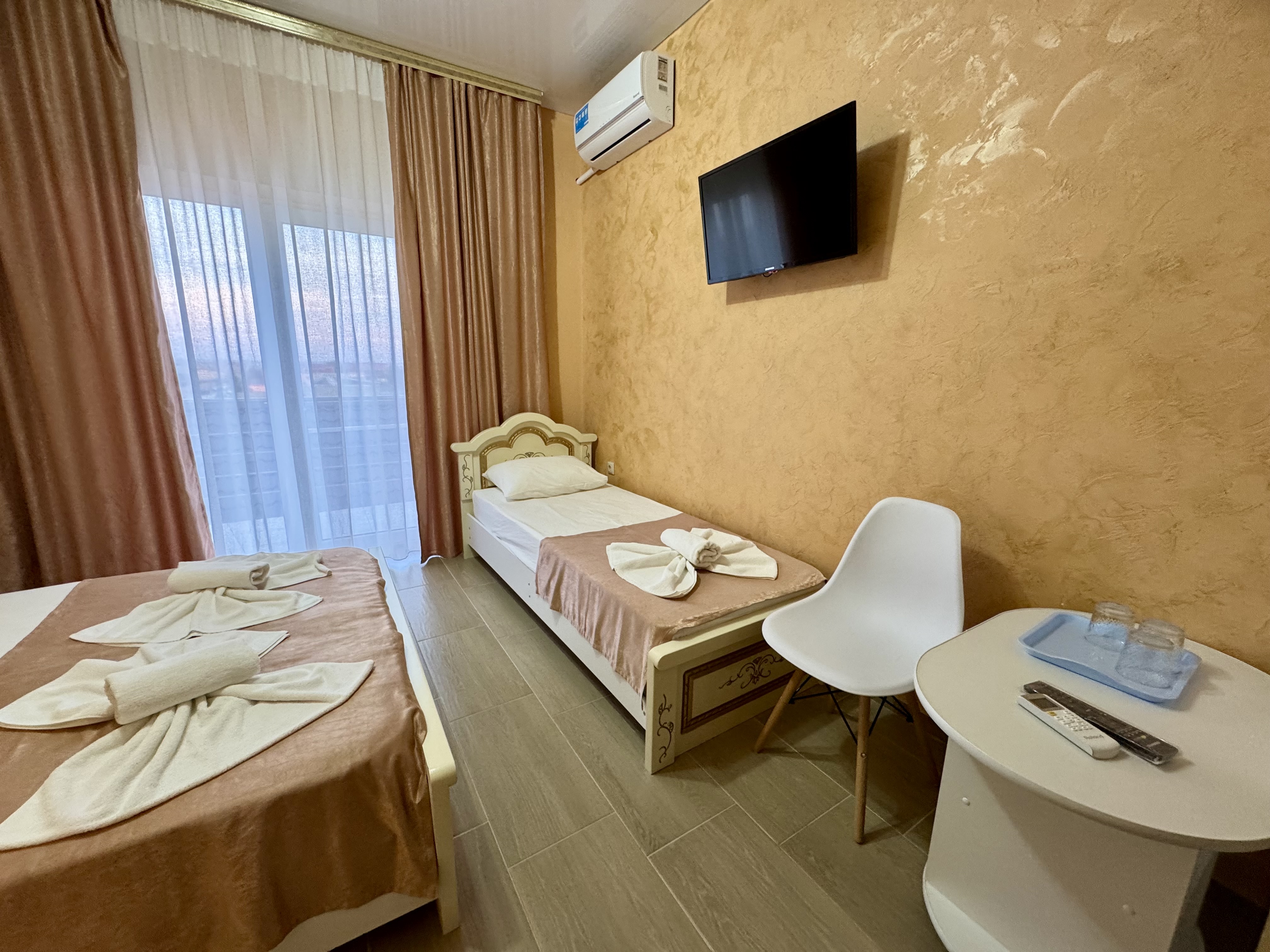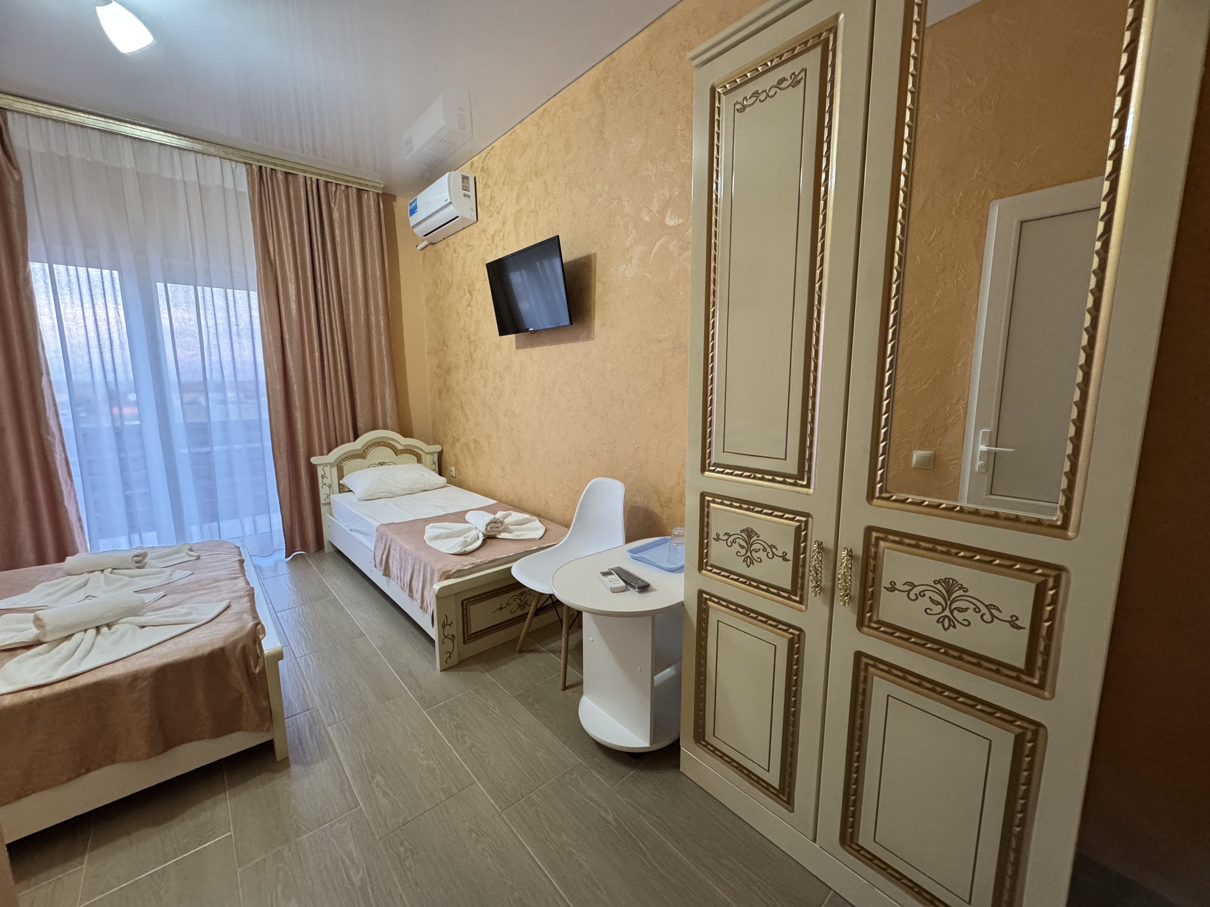 Номер на 3 этаже с мебелированным балконом 22 кв м. Есть номера с видом на море и озеро. Оборудование: телевизор, спутниковое, цифровое тв, холодильник, кондиционер, фен, средства личной гигиены Удобства: туалет и душ в номере, санузел совмещенный Смена полотенец 1 раз в 4 дня( по запросу ), уборка номера со сменой постельного белья и полотенец 1 раз в 8 дней