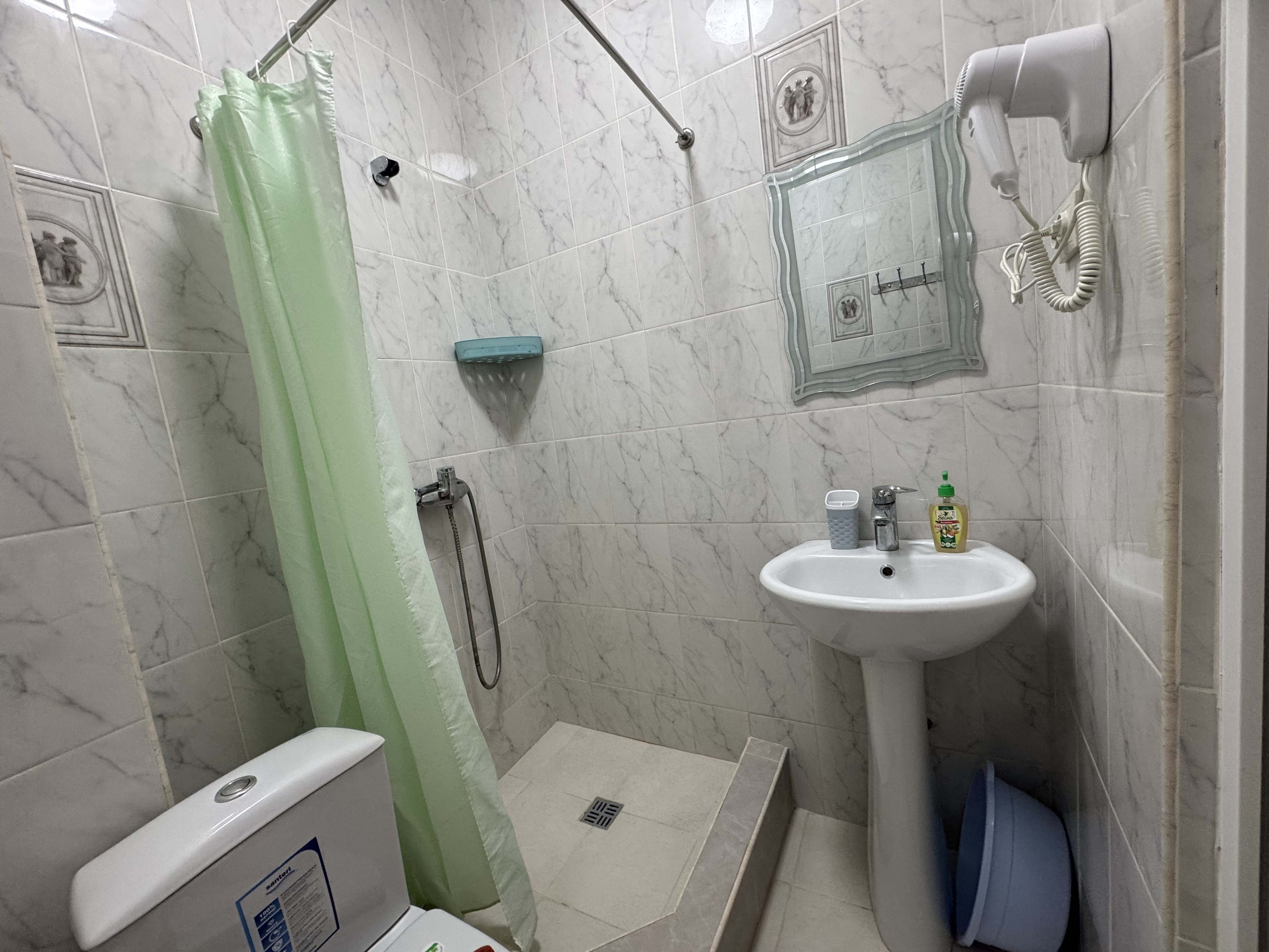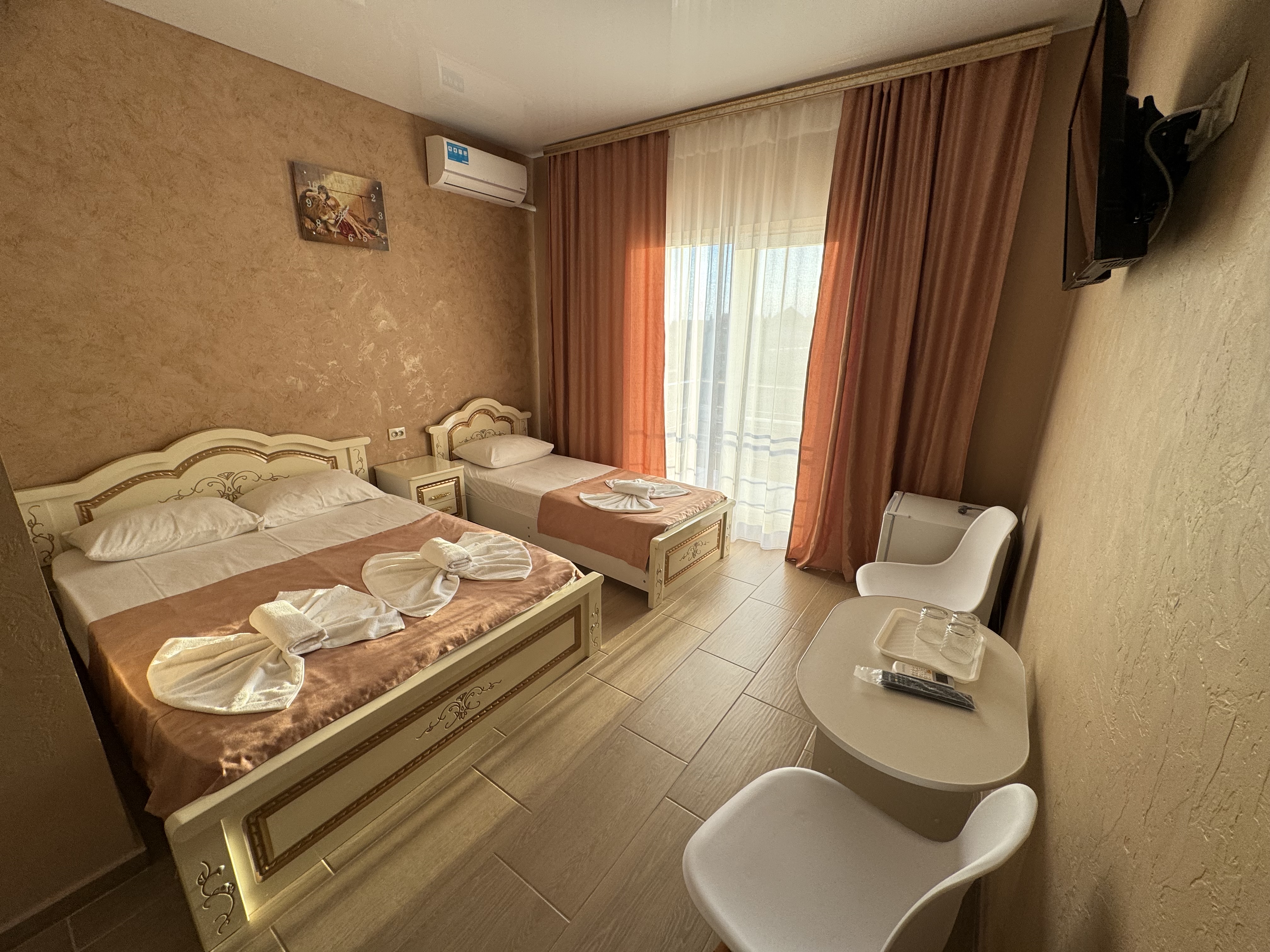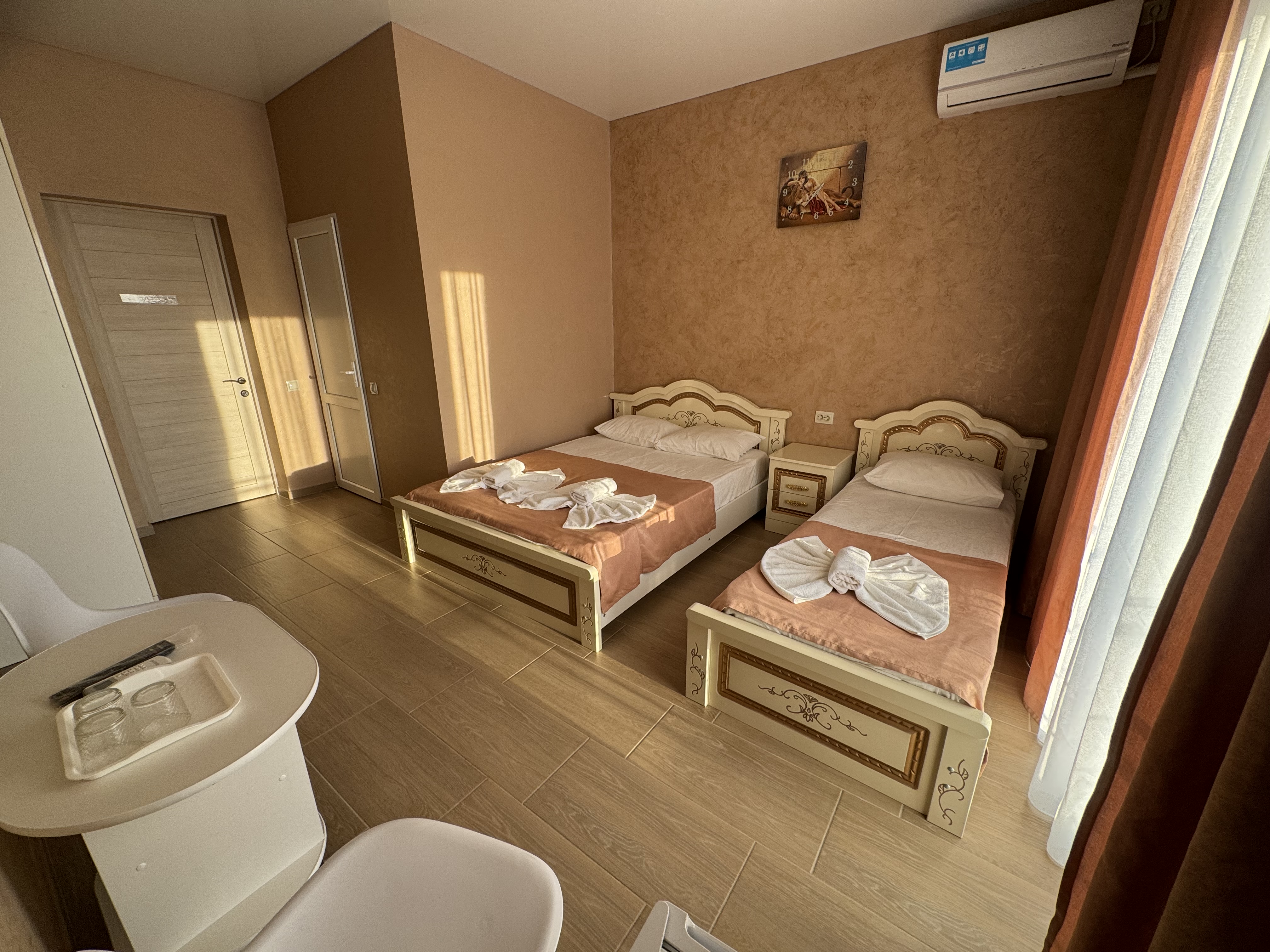 Номер на 3 этаже с мебелированным балконом 22 кв м. Есть номера с видом на море и озеро. Оборудование: телевизор, спутниковое, цифровое тв, холодильник, кондиционер, фен, средства личной гигиены Удобства: туалет и душ в номере, санузел совмещенный Смена полотенец 1 раз в 4 дня( по запросу ), уборка номера со сменой постельного белья и полотенец 1 раз в 8 дней